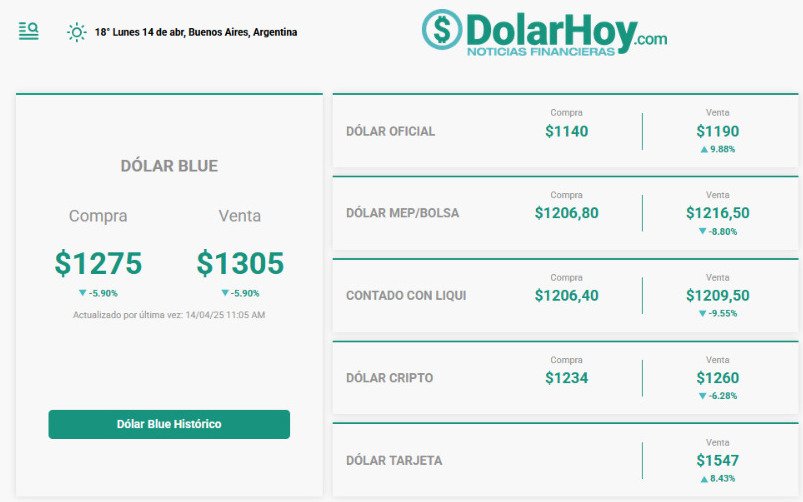 El dólar oficial cotiza este lunes 14 de abril a $ 1.190 para la venta en la pizarra del Banco Nación, en el primer día sin cepo cambiario. En bancos privados, la divisa llega a los $ 1.300, en el interior supera ese valor. Se espera que la devaluación, exigida por el FMI, recalienten la suba de precios, muchos negocios paralizaron transacciones, llevando en algunos casos a subas de hasta un 100%, cabe destacar, que la economía se maneja por expectativas, y la devaluatoria es la más suceptible, se espera que la devaluación del peso sea de entre un 15% y 20%, esto en los importes de apertura del día.